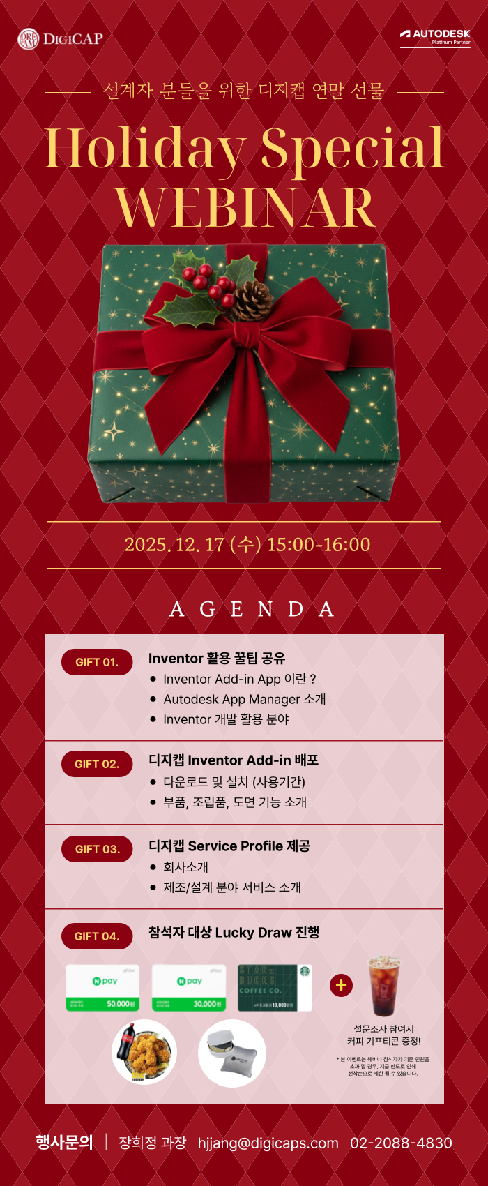 ¾È³çÇϼ¼¿ä, ¿ÀÅäµ¥½ºÅ© Ç÷¡Æ¼³Ñ ÆÄÆ®³Ê µðÁöĸÀÔ´Ï´Ù. ¿¬¸»À» ¸Â¾Æ, µðÁöĸÀÌ ÁغñÇÑ Æ¯º°ÇÑ ¼±¹° °°Àº Àκ¥ÅÍ ¿þºñ³ª¿¡ ¿©·¯ºÐÀ» ÃÊ´ëÇÕ´Ï´Ù. À̹ø ¿þºñ³ª¿¡¼´Â µðÁöĸÀÌ »õ·Î °³¹ßÇÑ Inventor Add-in°ú µðÁöĸÀÇ ¼ºñ½º Àüü ±¸¼ºÀ» ÇÑ´«¿¡ È®ÀÎÇÒ ¼ö ÀÖ´Â ¼ºñ½ºÇÁ·ÎÆÄÀÏÀ» ¼Ò°³Çϰí Âü¼®ÀÚ ºÐµéÀ» ´ë»óÀ¸·Î ¹èÆ÷ÇØµå¸± ¿¹Á¤ÀÔ´Ï´Ù. ³»³âÀ» À§ÇÑ »õ·Î¿î ±â´É°ú ¼ºñ½º ¹æÇâÀ» ¼Ò°³ÇÏ´Â À¯ÀÍÇÑ ½Ã°£ÀÌ´Ï ¸¹Àº °ü½É ºÎʵ右´Ï´Ù! ¶ÇÇÑ ³×À̹öÆäÀÌ 50,000¿ø±ÇºÎÅÍ Ä¡Å², Äí¼Ç ´ã¿ä µî ´Ù¾çÇÑ °æÇ°ÀÌ ÁغñµÈ ¿¬¸» ·°Å°µå·Î¿ì À̺¥Æ®🎁µµ ÇÔ²² ÁøÇàÇÏ´Ï, À̹ø ¿þºñ³ª¸¦ ÅëÇØ À¯ÀÍÇÑ Á¤º¸¿Í ´õºÒ¾î ÀÛÀº ¼±¹° °°Àº ÇýÅõµ ¹Þ¾Æ°¡¼¼¿ä! ÀÏÁ¤: 2025. 12. 17 (¼ö) 15:00 ~ 16:00 Âü¼®¹æ¹ý: »çÀü½Åû ÈÄ ¹ß¼ÛµÈ Âü¼®¸µÅ©·Î ¿Â¶óÀÎ Âü¼® 📞 ¹®ÀÇ: 02-2088-4830 hjjang@digicaps.com ½Åû¸µÅ© https://forms.gle/gpzdTqqhnNtuTjwZ6